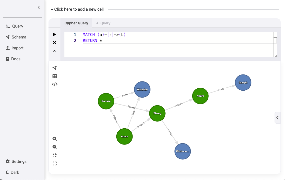 The advantage of using Ryugraph Explorer to run queries during the prototyping and exploration phase is that you can visualize the graph as you query it. Additionally, you can view the query results as a table or as JSON, allowing you to easily design and test your application logic.