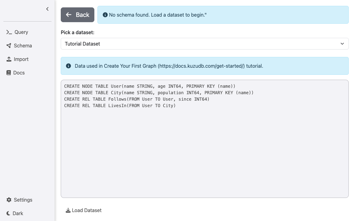 docker run -p 8000:8000 --rm ryugraphdb/explorer:latestClick on the Datasets tab on the top right corner and then: (i) you can select one of the bundled datasets