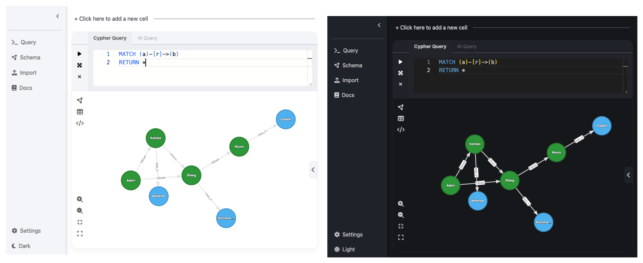 Ryugraph Explorer is a browser-based frontend to visualize and explore Ryugraph database schemas and query results in the form of a graph, table, or JSON. This is a useful tool for exploring your graph data and debugging your data model during the prototyping phase. An example visualization (in light mode and dark mode) is shown below.