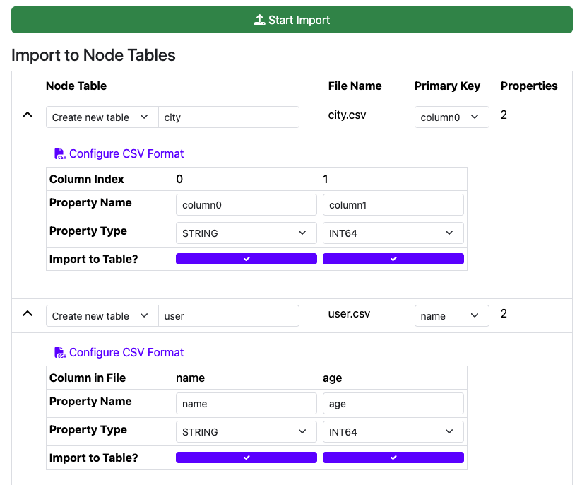 If your CSV file doesn’t contain a header row, Ryugraph cannot make assumptions about your table’s column names, or, for node tables, which of the columns is the primary key column. In such cases, you will need to expand the table’s options by clicking on the downward arrow to manually specify the column names.
