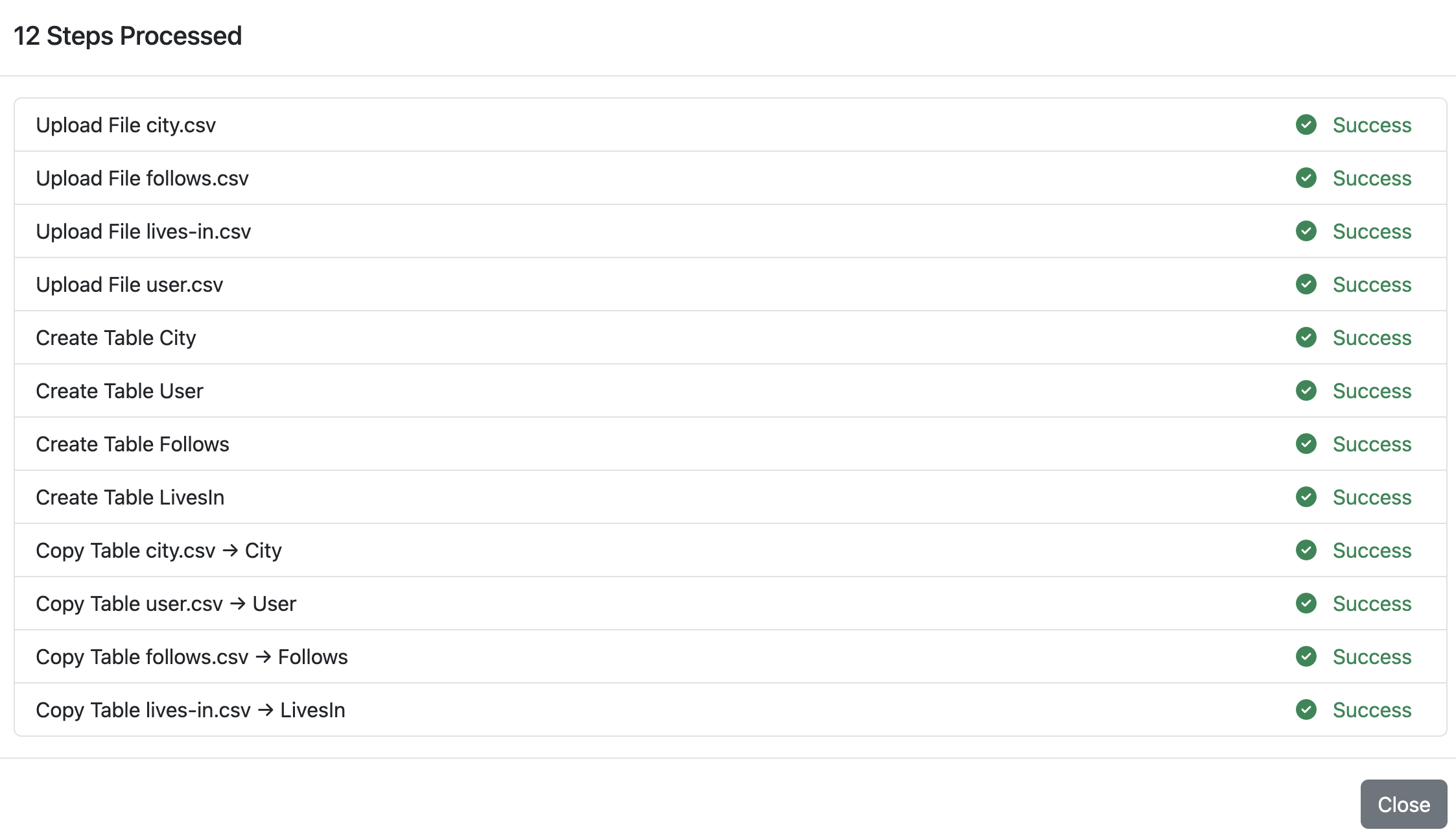 Begin the import by clicking the “Start Import” button on the top of the UI. This will first display a summary of all the tables that are going to be copied into the database. Click on the “Execute” button to confirm execution.