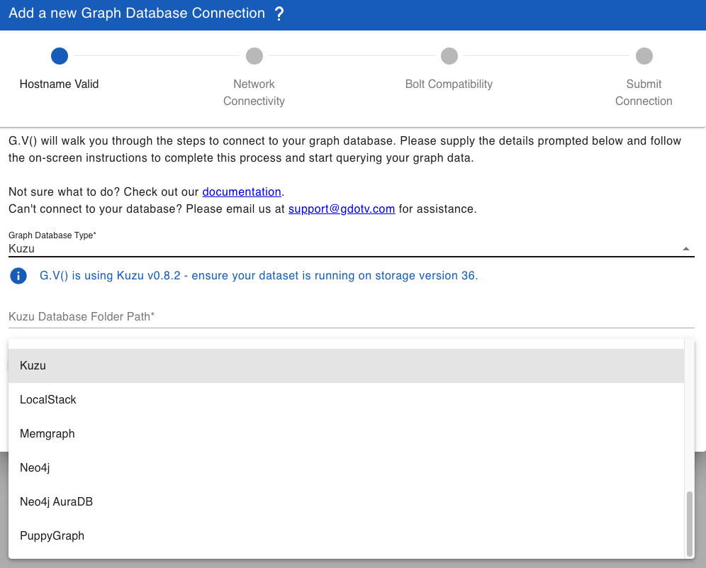 G.V() directly connects to a local Ryugraph database. First, open the G.V() application and click on the “New Database Connection” button. You can select Ryugraph from the list of supported databases as shown below.