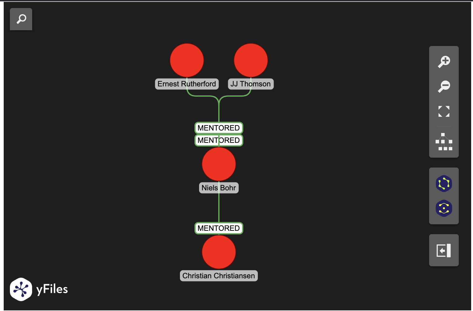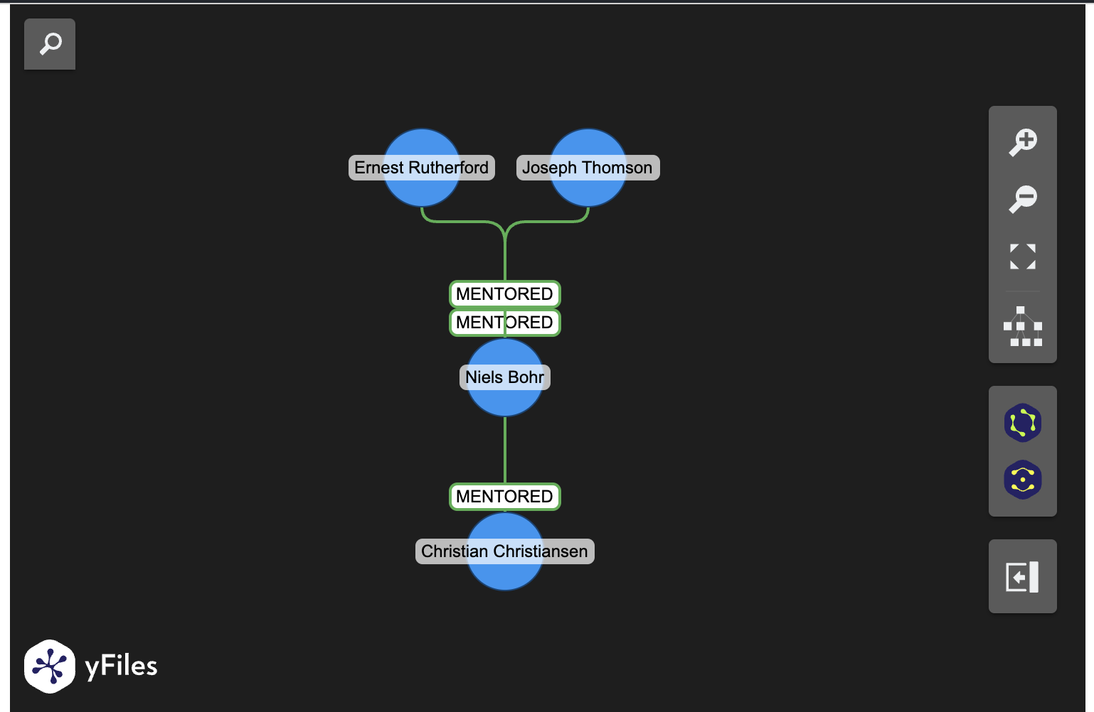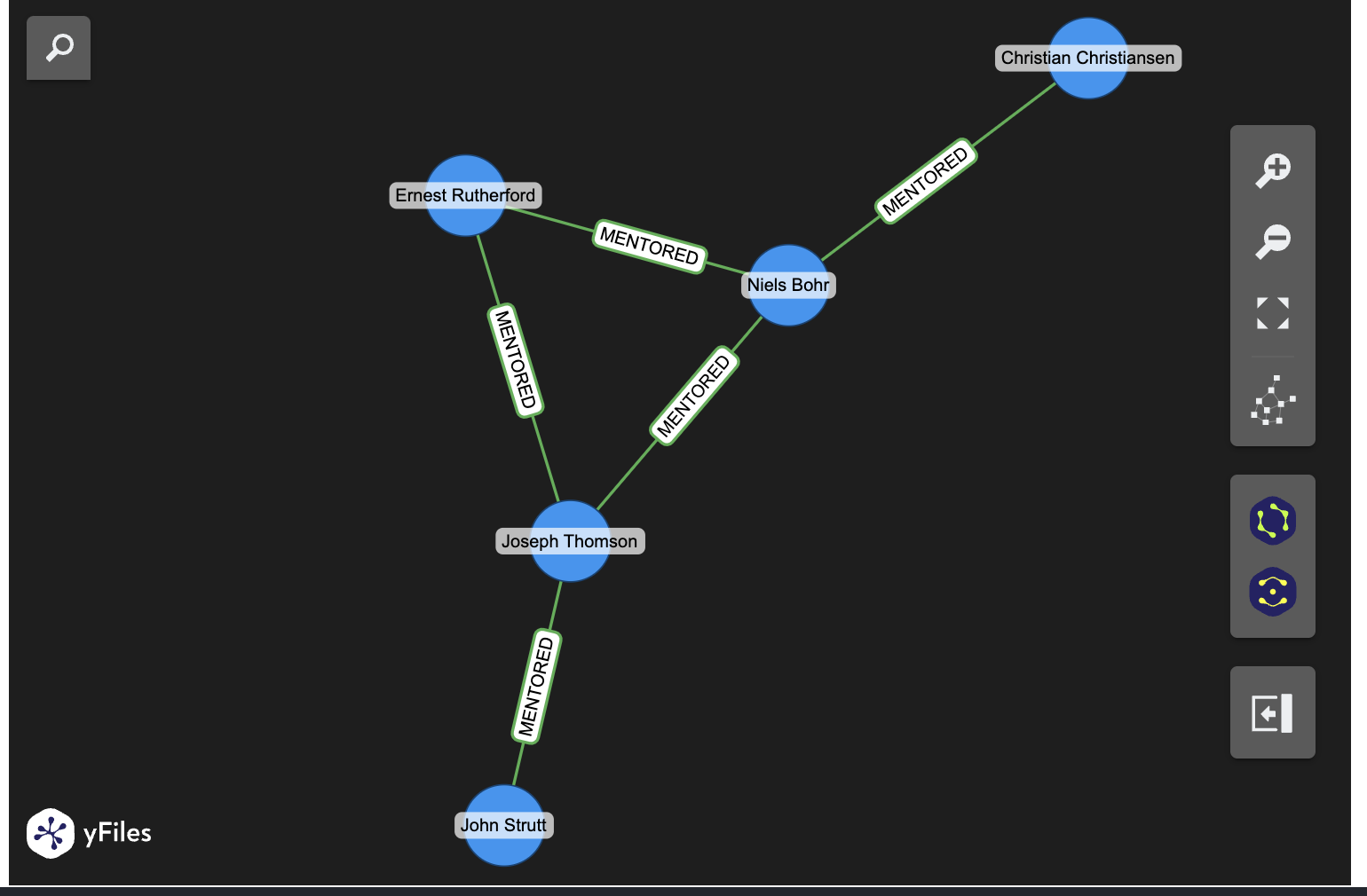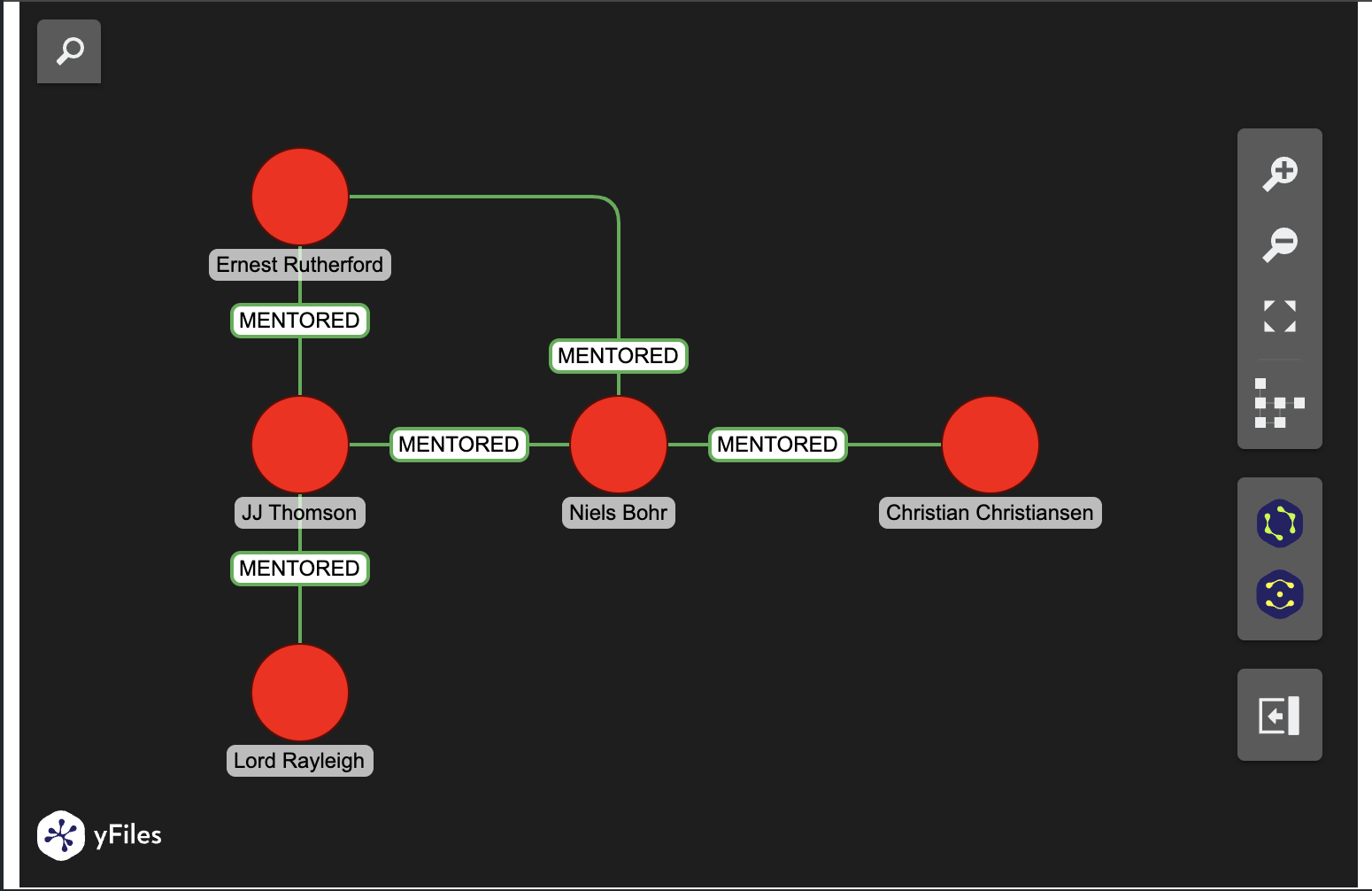 import ryugraphfrom yfiles_jupyter_graphs_for_ryugraph import RyugraphGraphWidget# Open a new in-memory databasedb = ryugraph.Database(":memory:")conn = ryugraph.Connection(db)# Create tablesconn.execute("CREATE NODE TABLE Person(name STRING PRIMARY KEY, alias STRING)")conn.execute("CREATE REL TABLE MENTORED(FROM Person TO Person)")# Insert dataconn.execute(""" MERGE (a:Person {name: "John Strutt", alias: "Lord Rayleigh"}) MERGE (b:Person {name: "Joseph Thomson", alias: "JJ Thomson"}) MERGE (c:Person {name: "Ernest Rutherford", alias: "Ernest Rutherford"}) MERGE (d:Person {name: "Niels Bohr", alias: "Niels Bohr"}) MERGE (e:Person {name: "Christian Christiansen", alias: "Christian Christiansen"}) MERGE (a)-[:MENTORED]->(b) MERGE (b)-[:MENTORED]->(c) MERGE (b)-[:MENTORED]->(d) MERGE (c)-[:MENTORED]->(d) MERGE (d)-[:MENTORED]->(e)""")Display graph with default layout
