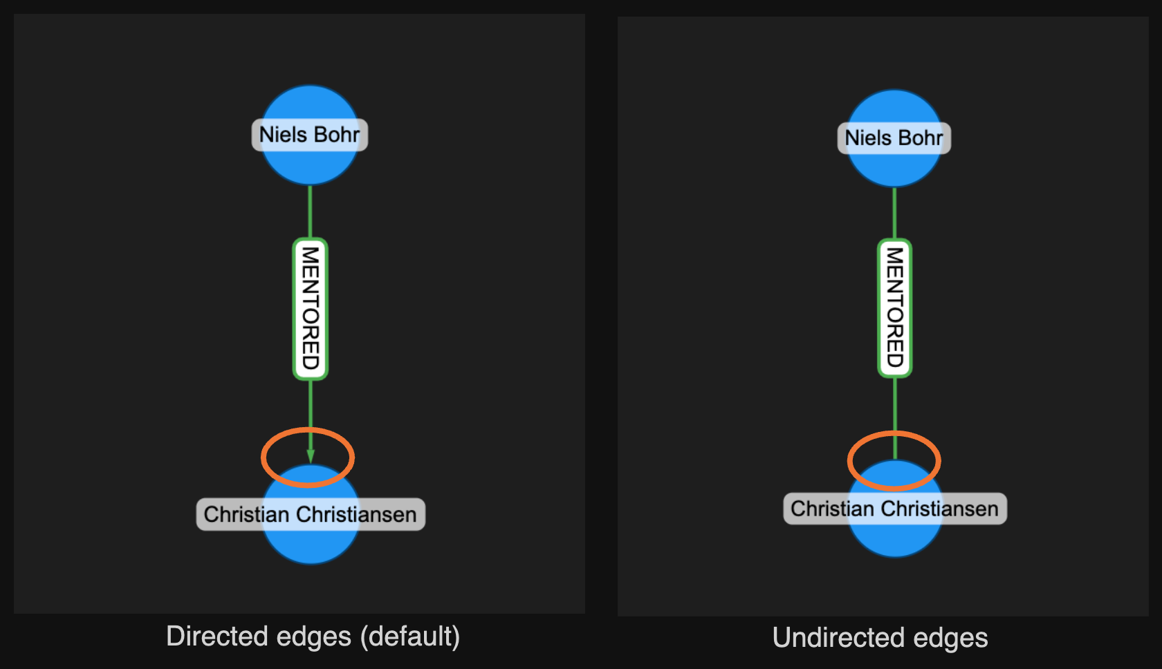 To visualize relationships as undirected, you can pass the undirected parameter to the show_cypher method: